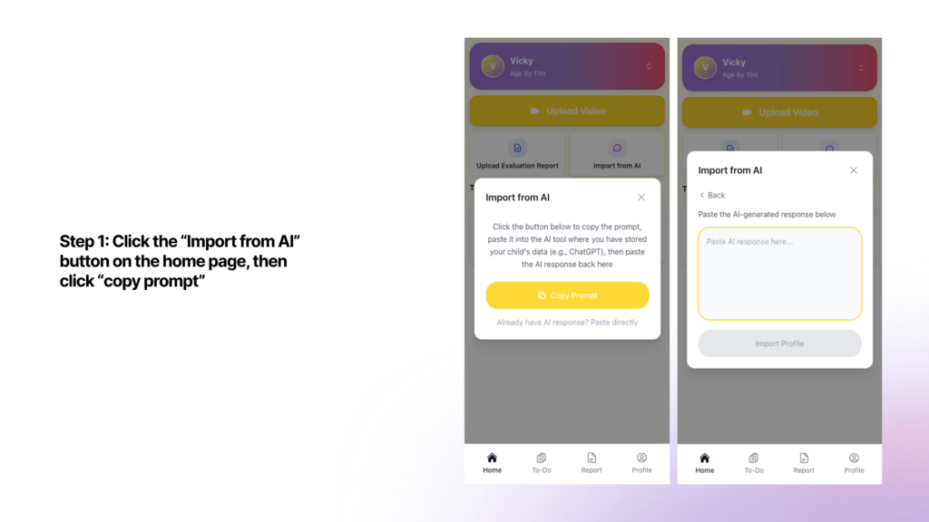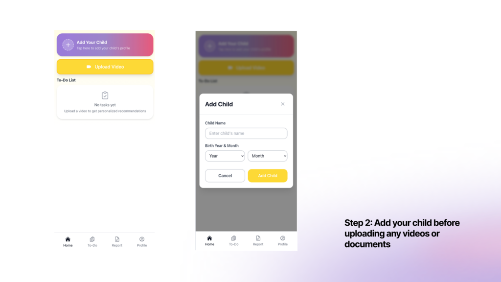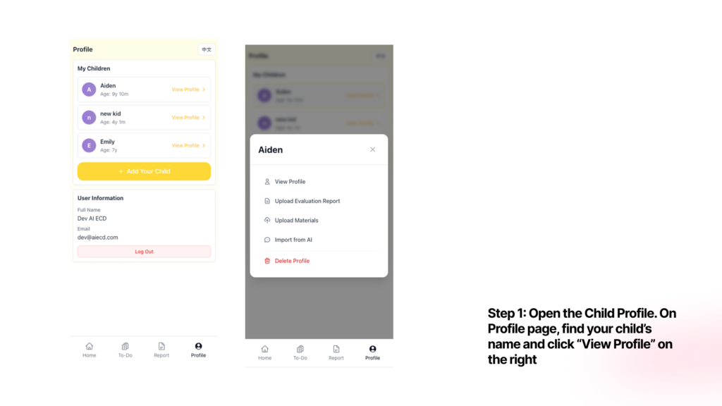 Kidooo Family User Tutorial 用户教程中文版 Part 1: Create Account and Add Your Child Part 2: Upload Video and View Report Part 3: To-Do Page Part 4: Upload Evaluation Report Part 5: Import from AI Part 6: Child Profile